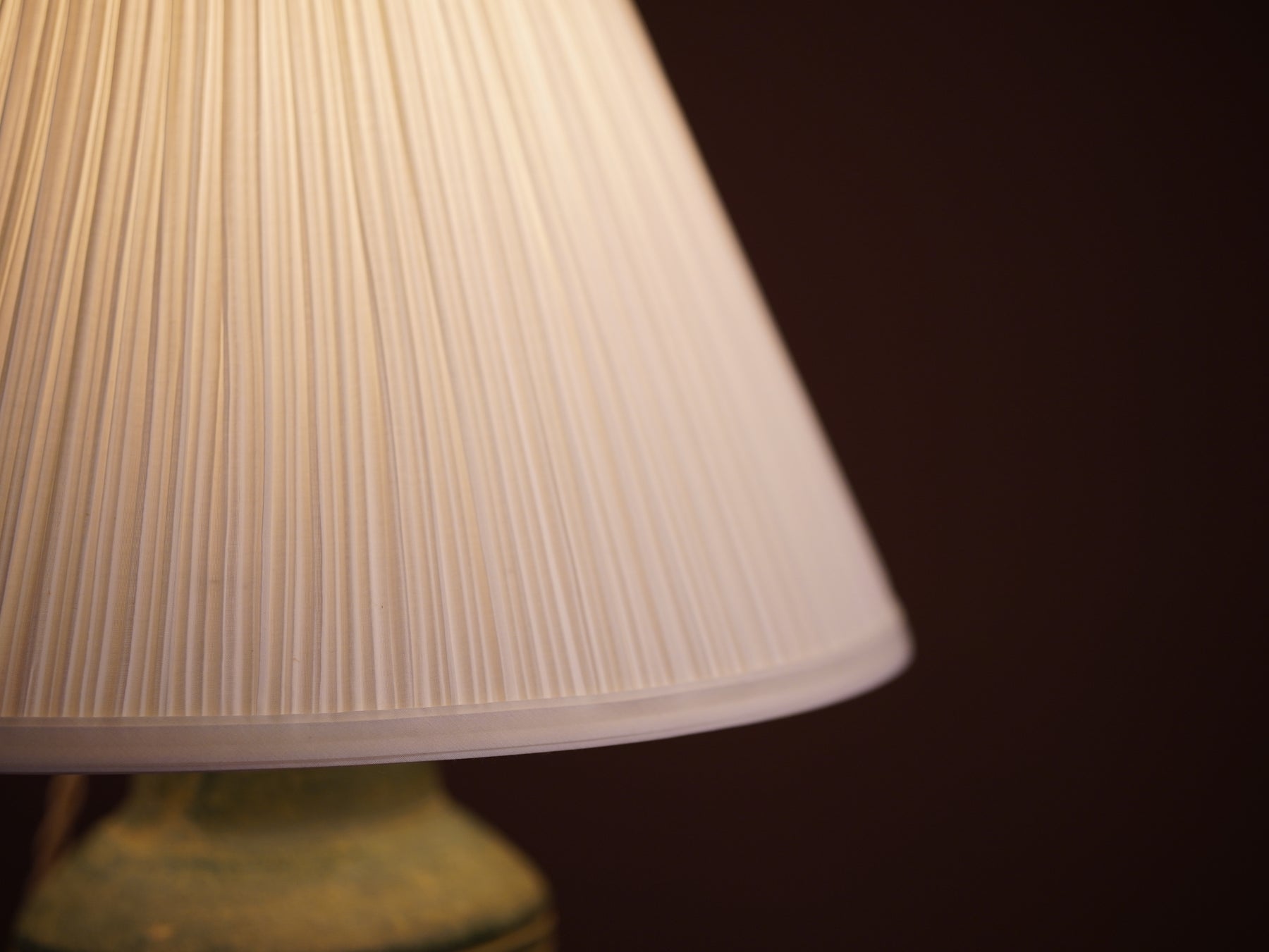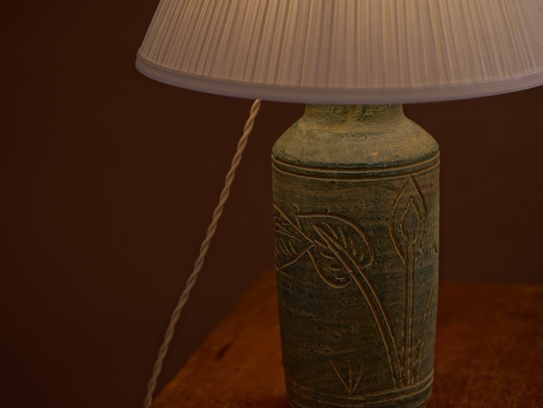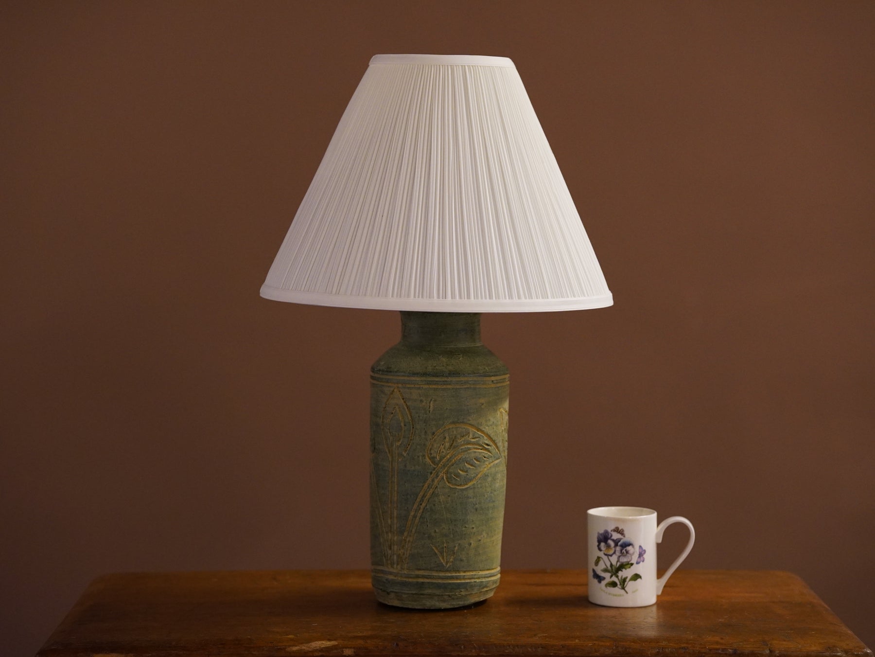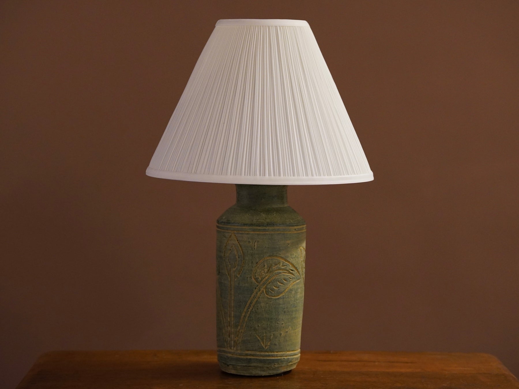 The base stopped me immediately: a large handmade studio pottery vessel with sgraffito botanical carvings and a matte green glaze that breaks into warm ochre where the clay is revealed. There isn't a makers mark, just a beautiful object with a story I couldn't trace. A crisp pleated shade keeps the focus where it belongs.