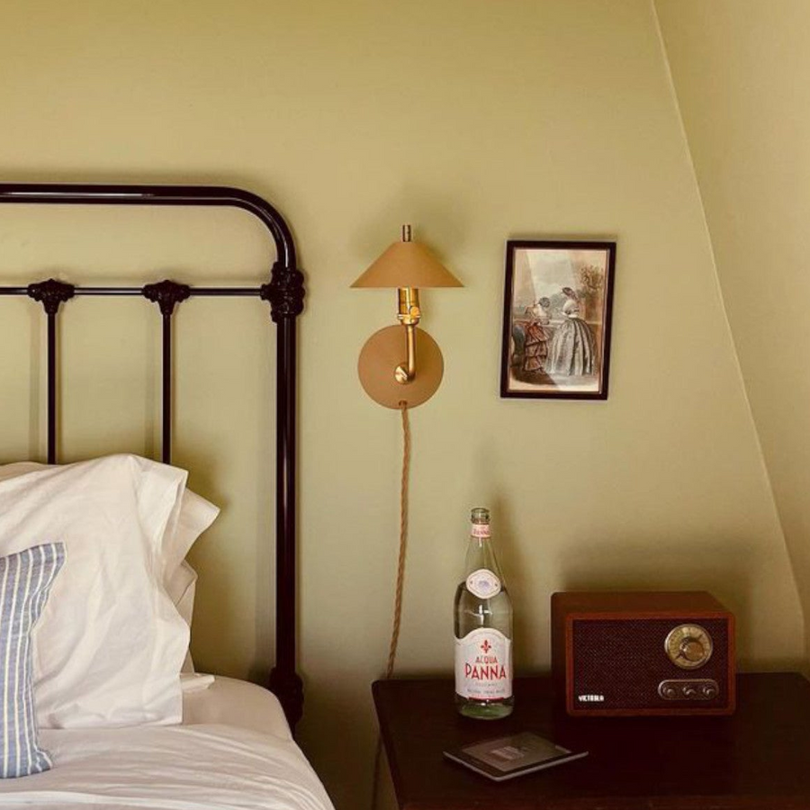 This plug-in wall lamp exudes warmth. We work with an amazing shop in Hawaii to get the oversized acacia canopies. I love the way the wood's organic grain plays with this fixture's clean geometry.